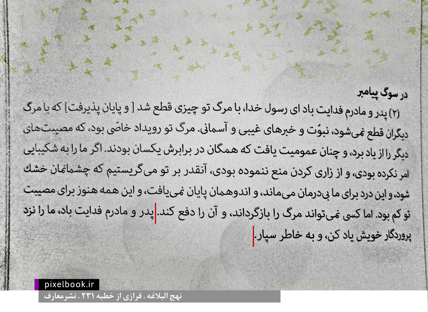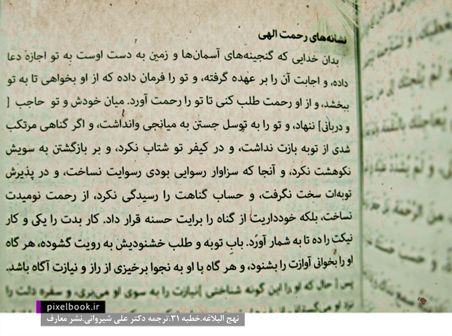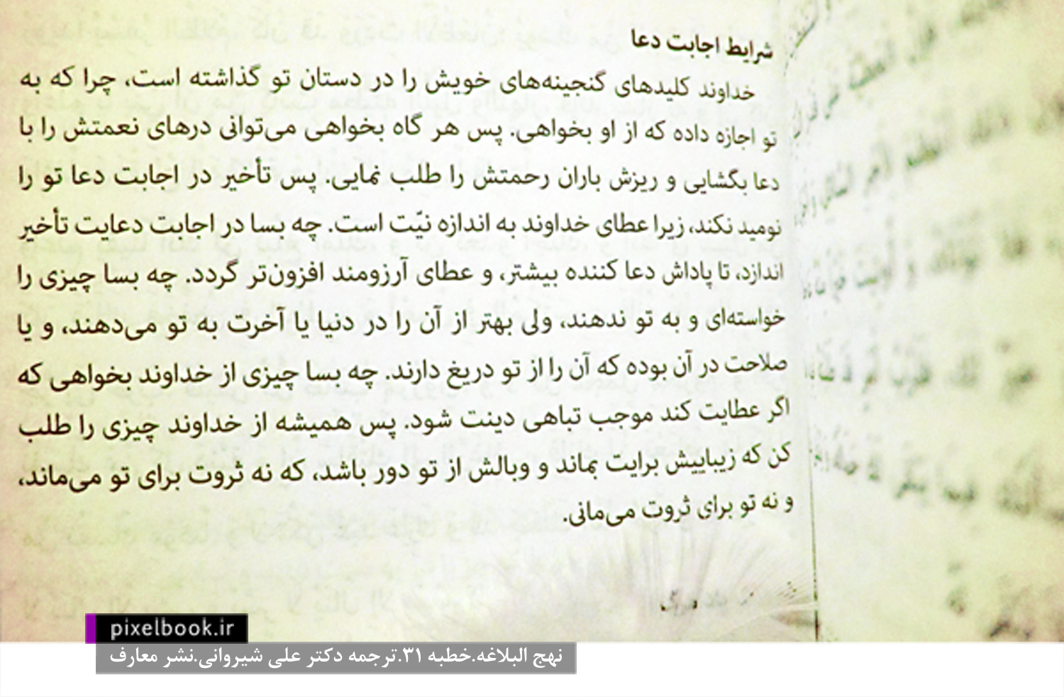 نهج البلاغه اولین کتابی است که صفحات و خطوط نورانی آن در اینجا با کمک شما به اشتراک گذاشته می شود. انشالله با تأمل و تفکر در بیانات زیبای امیر بیان، حضرت امیرالمؤمنین علی علیه السلام، اهداف زندگی خود را بهتر پی ریزی کنیم. تعداد ارسال های شما به اولین سوژه پست مشترک، خوب بود در حالی که می دانیم فقط یک هفته از عمر اینجا گذشته است و تازه اول کار است . . . دست مریزاد به فرستندگان عزیز! تا اواخر امشب این مطلب را پست ثابت می گذاریم تا شما هم ترغیب به مطالعه این کتاب شوید و در پست مشترک ما شریک گردید. در ادامه مطلب تصاویر آمده است.
