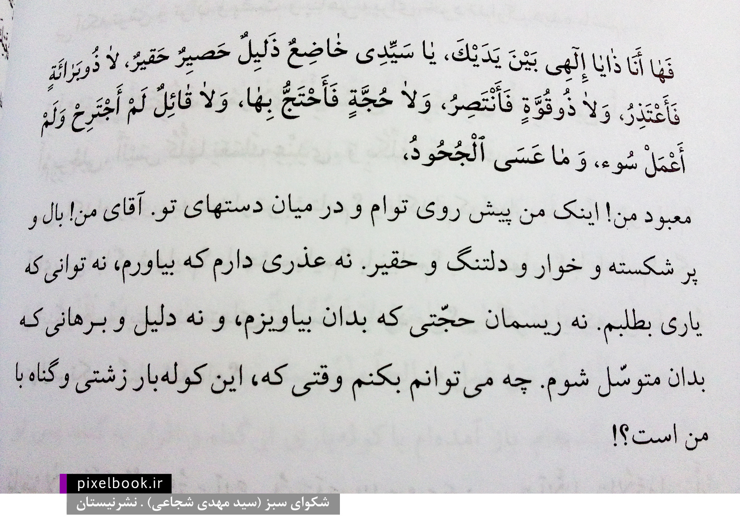 یادداشت فرستنده: "شکوای سبز 1 دریافتی است از سه مناجات عرفه، ندبه و شعبانیه. زبان کتاب لحنی است میان دریافت و ترجمه. نه فقط ترجمه است و نه گستردگی دریافت را دارد. نویسنده کوشیده است با تشبیهات و استعارات متنوع و رنگارنگ، در انتقال معنای دعا به مخاطب زیباترین و سهلترین مسیر را بپیماید. نویسنده در زیر عبارت «متی نعادیک و نراوحک فنقر عینا» از دعای ندبه مینویسد: کی میشود صبح ناشتای چشمهایمان را به نگاه تو بگشاییم؟ کی میشود شام تصویر تو را به قاب خوابهایمان ببریم؟ کی میشود شب و روزمان در فضای ظهور تو بگذرد؟ کی میشود عطر ظهور تو در شامه جهان بپیچد؟ کی میشود صدای گامهای آمدنت در گوش هستی طنین بیندازد؟"